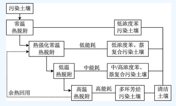 減少能源消耗和提倡使用破壞或降解污染物的修復技術是綠色可持續修復的原則,采用原地異位修復;在修復技術上,采用逐級熱脫附集成技術。對于低濃度苯污染土壤采用常溫熱脫附技術;對于低濃度苯、萘復合污染土壤采用低能耗的熱強化常溫熱脫附技術;對于中/高濃度苯、萘復合污染土壤采用中能耗的低溫熱脫附技術;對于多環芳烴污染土壤采用高能耗的高溫熱脫附技術;利用高溫熱脫附的余熱進行熱強化常溫熱脫附,實現余熱回用,提高能源利用效率。通過采用精細化熱脫附集成修復技術,大幅減少了高溫熱脫附技術處理的土方量,降低了能耗和環境足跡,提高了能源利用效率。